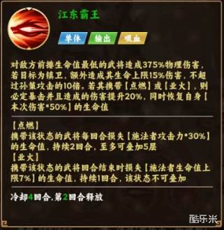 而自带复活技能的甘宁和能提供护盾与复活的小乔,则为需要依靠回合数来触发持续伤害的燃烧流队伍提供续航能力。核心武将:甘宁、孙策、周瑜、吕蒙、小乔