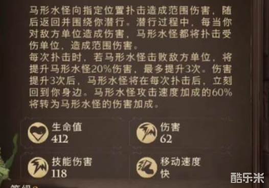 哈利波特魔法觉醒马形水怪试炼中召唤者每次平A或用咒语命中敌怪,水怪能同步对目标扑击一次并造成AOE。也就是说本体的目标是哪里,马形水怪就会跟着往哪里扑。若本体释放出的是群攻,那水怪会扑向先手命中的敌方单位。每次扑击能提升百分之十二伤害,最多能叠加到百分之三十六。可在水怪头顶的圆圈上查看叠伤印记,若是三条花瓣都亮起来就表示叠满了。