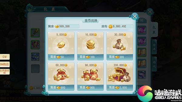 3、元宝兑换,在背包,金币数量后面的小加号点击进去,可以使用元宝兑换金币。