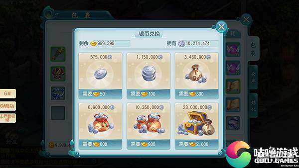元宝可以通过包裹界面,进行金币,银币兑换。