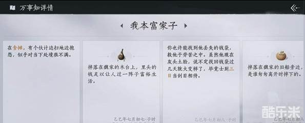 玩家要在未时到酉时之间前往芥子芦的界碑周边。偷听庐边的齐思贤对话,随后在亥时和素怀微交谈。交谈完毕前往房间二楼,捡到方白的信。将信件交给齐思贤或者素怀微,均可以完成万事知。