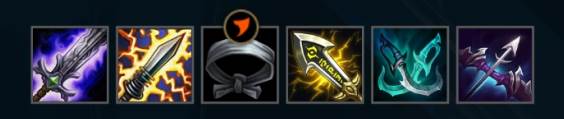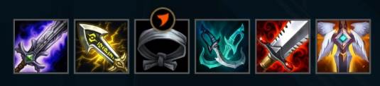 出完破败王者之刃增加吸血和攻击速度之后,看情况如果面伤害还没起来的话可以先出一件加暴击的,然后再出水银饰带加韧性和移除控制效果,注意击飞无法移除,继续出凡性的提醒加穿透,最后堆暴击就行了,因为这个英雄大招有无敌所以不需要保命装。因此需要注意大招的释放时机。