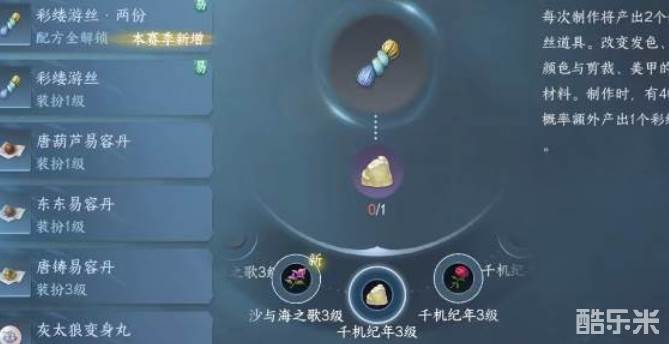 彩缕游丝的制作方式为两种,第一种是使用采摘或挖矿获取到的草药或矿石来制作,使用这种方式获取到的彩缕游丝通常都是可交易的。也能在商城交易行直接购买相关草药和矿石来制作出可交易的彩缕游丝,同时要耗费一定的活力。每次制作都能产出两根,并且还有概率额外产出一根,适合想要获取可交易彩缕游丝进行上架售卖的玩家。