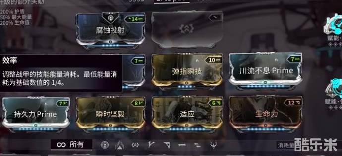 星际战甲技能效率的上限为75%,超过部分无效。常见的技能效率MOD包括简化和弹指瞬技,前者直接降低技能能量消耗,后者在减少消耗的同时略微缩短技能持续时间。弹指瞬技若未满级,建议暂缓升至4级以平衡属性。下面和酷乐米小编一起来看看吧