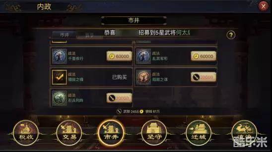 最后编辑于8年前随着游戏进程的推进,每个赛季都会有一些新的元素出现。在新征服赛季中,市井商店除保留了【训练有素】、【领兵有方】等战法之外,新增的三个战法十分引人注目,分别为【猎敌之锋】、【陷敌之谋】和【形兵列阵】。