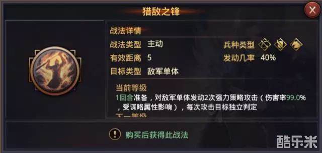 【猎敌之锋】,顾名思义,对敌人的“锋刃”进行猎杀,是法系对抗物理系的战法。其有效距离为5,如果由我方大营佩戴,可以攻击到敌方大营;发动几率40%,需要准备1回合,期望发动次数为2次。