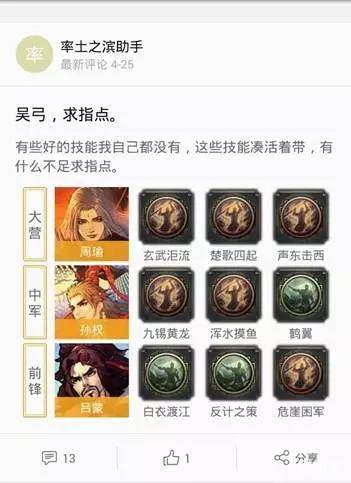 太史慈前不久进行了大幅度的增强,铁骑我则是高高兴兴的换下了鲁肃带上了太史慈。我实际使用中的技能配置和这里面有所不同,我周瑜没带大法,而是带的一个神兵。