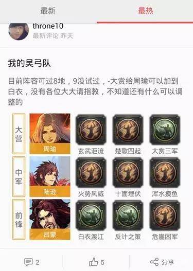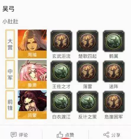 本队吕蒙没什么好说的,陆逊的十面我觉得可以换成始计,一定程度上保证出手,也可以换成不攻或者深谋远虑增加伤害,让输出爆炸。至于周瑜的大赏,我建议换成神兵。