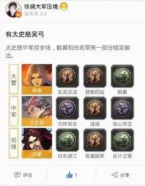 本队中吕蒙老套路双指挥。中军太史慈双追击控全场,之所以用连战,是因为先驱突击那是爆发类技能,太史慈不是爆发类武将,属于半控半输出。而连战发动几率很不错,并且不会被战必真对那么明显。大营不带大法我是觉得鹤翼输出加上吕蒙的白衣稳定输出可以获得一个不低的稳定输出。