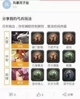 吴国国家队可以说是没有吕布的玩家最想要的弓兵组合之一。这个队伍阵容合理,输出与控制兼具。吕蒙标配危崖反记,配合白衣可以在爆发最多的前两三回合有效的保护自己。中军孙权的主战法除了能给全队上规避加防御,还可以消除有害状态。这个有害状态四个字包括动摇恐慌之类的持续伤害,还包括各类控制。孙权的速度又高于两个队友,他这个技能的发动可以有效降低战损并保证队友出手。