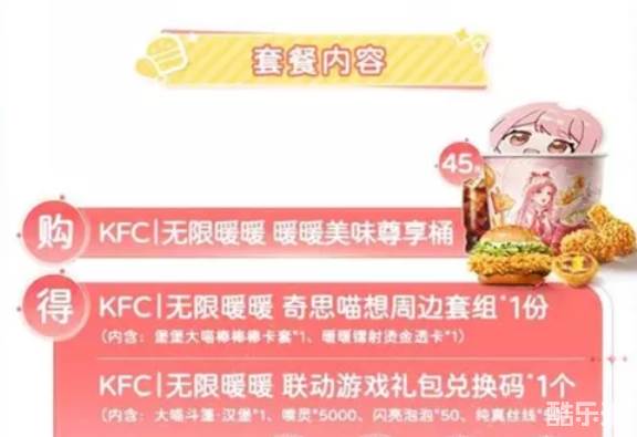 活动主题为“暖暖漫游美食王国”,活动期间,玩家可在全国肯德基门店购买限定联动套餐,获得对应周边与游戏礼包:奇思喵想周边套组:包含卡套、镭射透卡及联动礼包兑换码,暖堡堡手机背夹套组:附带兑换码与限定周边。下面和酷乐米小编一起来看看吧