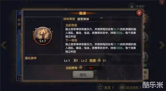 接下来是郭嘉的战法,满级为鬼谋“阻止敌军单体恢复兵力,并使其每回合有40几率陷入混乱、暴走、怯战、犹豫中,持续3回合”。重点中的重点是最后一句话了,每个效果独立判断,这就意味着中了这个Buff的敌军将连续3回合被4次判定,40%几率的4次判定,对面不受控制影响的几率仅为12%左右,基本上等于3回合的必控了。比起同样是单体控却只能控一回合的落雷迷阵,鬼谋能给队伍提供更多的帮助,而附带的阻止恢复效果对刘备等常见武将也是个威胁。