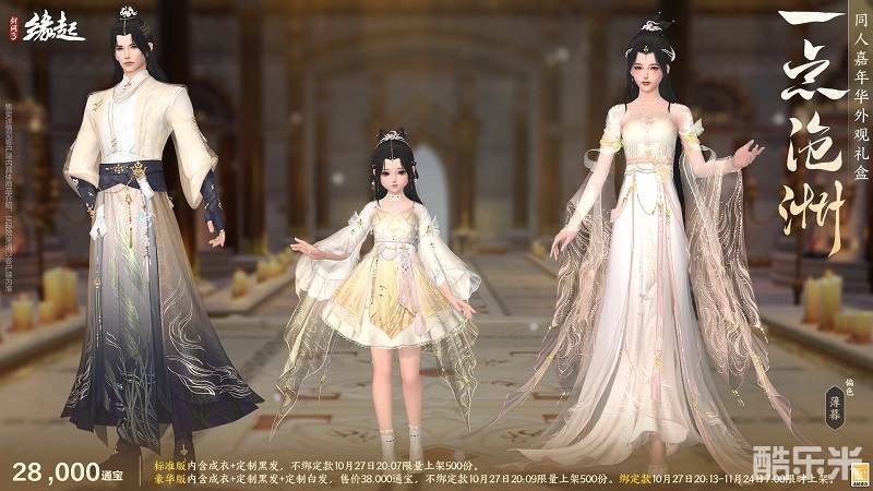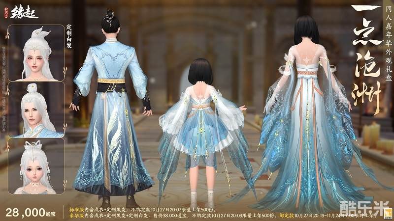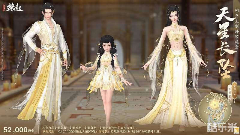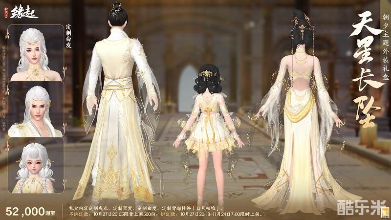 礼盒内含定制成衣、定制黑发、定制白发、定制背部挂件「日月相推」。外装以 "日月轮转" 为意,三体同承素白鎏金之制,衣间金纹星辉流淌,熠熠生辉,恍若天幕垂落。