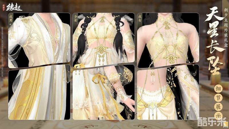 成女款轻纱覆体,袖摆灵动,行走间月光流转。上身设计精巧,大胆露出纤纤素腰,冰肌玉骨。裙身素白为主,腰间金色环佩叮当碰撞,摇曳生姿。