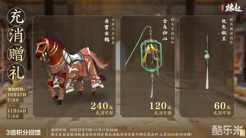 更有三倍积分回馈同步开启,10月27日7:00至11月11日24:00,侠士在全区服消耗通宝购买绑定商品,或购买并实装不绑定商品时,立享300%积分回馈,积分累积更快,兑换好物更轻松!
