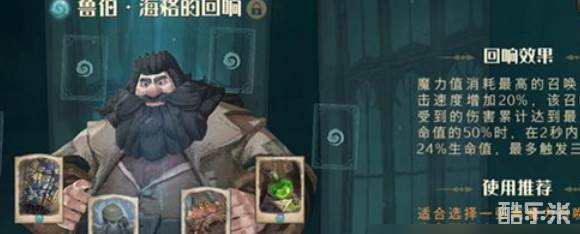 回响:鲁伯·海格,海格的回响效果为魔力值消耗最高的召唤卡攻击速度增加35%,当该卡牌受到的累计伤害达最大生命值的50%时,在2秒内回复28%的生命值,最多触发三次。