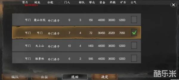 进入演武堂后,点击右上角“出征地”按钮,在这里可以选择派遣哪个据点的弟子出征。