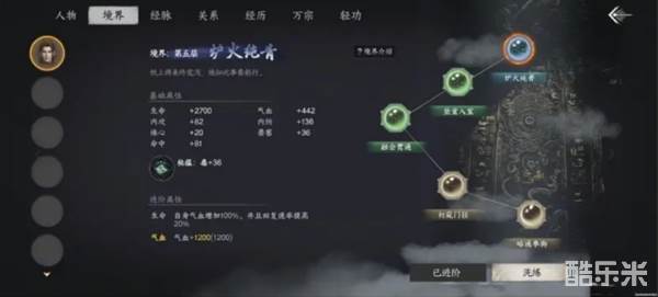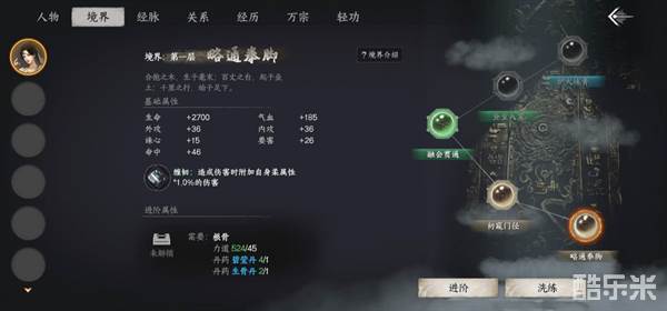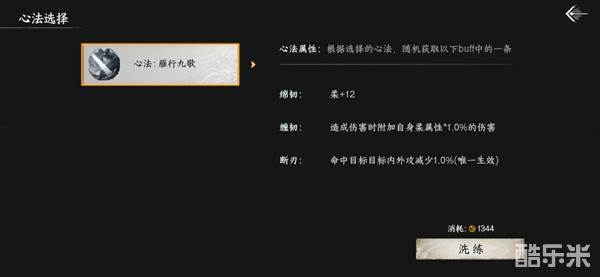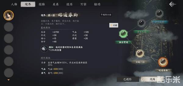 境界可添加心法洗炼,随机获取心法中的一条属性。不同境界需要的心法品级不同,境界越高,可添加的心法品质越高。