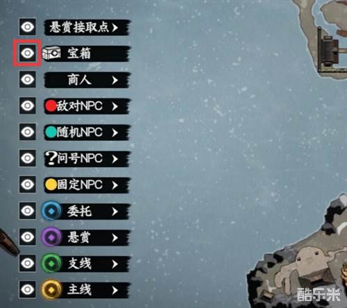 按 M 键打开地图左边筛选选项里宝箱前面的框打开(默认关闭)