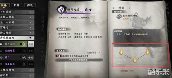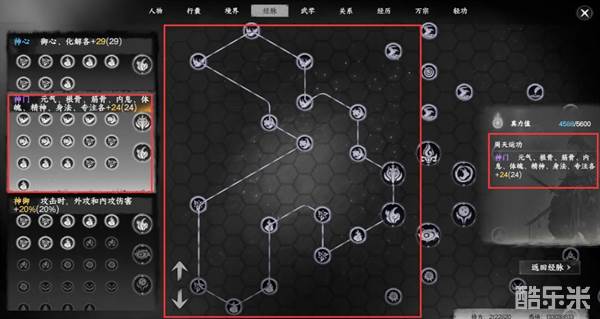 周天界面左边连线经脉对应的效果,中间点击一个经脉点左边会点亮对应的。把效果需求 的经脉全部点亮并连成闭环(一圈)即可。(注意别漏掉一个点) 。右边查看已经生效的 经脉