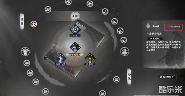 点击经脉界面的双鱼进入心法融合界面。中间位置必须放最高阶的心法,提供 3500 真力值。 周围 3