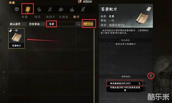 打开背包选中秘籍分类-配方,点击右上角【图鉴】,搜索配方名。点击配方,右边显示配 方信息,在获取途径下面点击坐标或直接按 Q 会定位到目标位置。直接买就行了。显示一 阶不用管实际是 7 阶。其他类型的书或者材料同理。