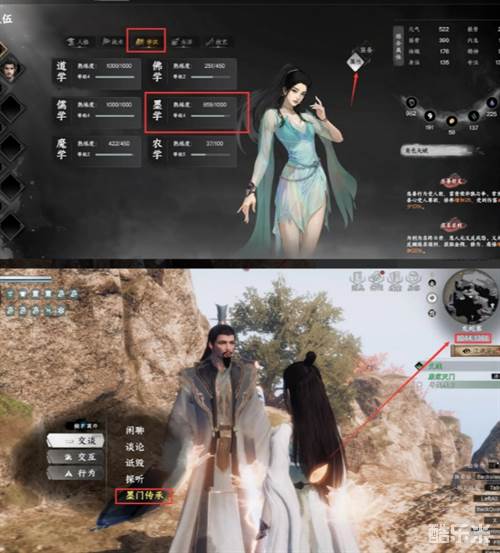 按 C 键打开属性界面,点击属性,切换到学识,查看墨学属性,300 即可,怎么升到 300 看上面的怎么升身份熟练度。属性达标后到上图坐标,跟机杼人偶对话接墨门传承任务, 对话完了就解锁了。