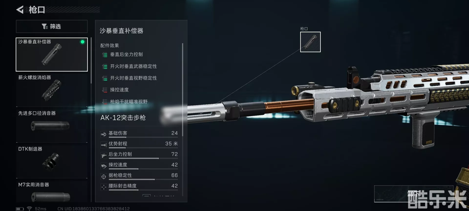枪口选择沙暴垂直补偿器。大幅度提升枪械垂直后坐力控制,略微减少枪械操控速度。