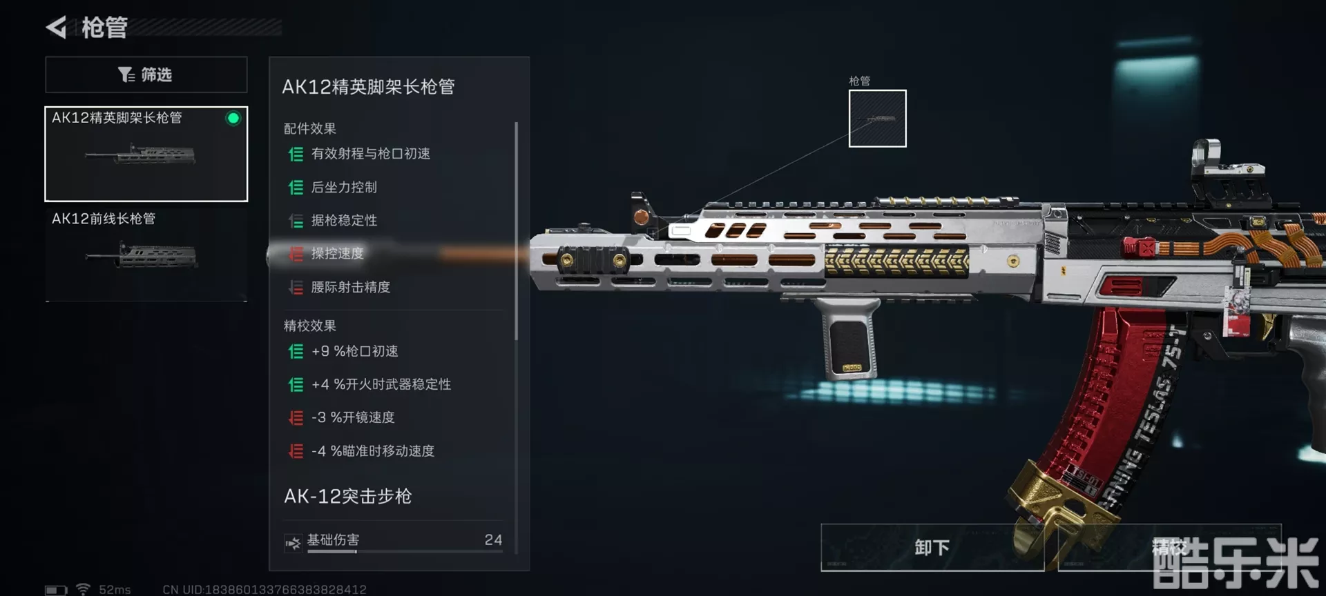 枪管选择AK12精英脚架长枪管。这个枪管提升了五米的射程,同时还增加了后坐力控制以及据枪稳定性。