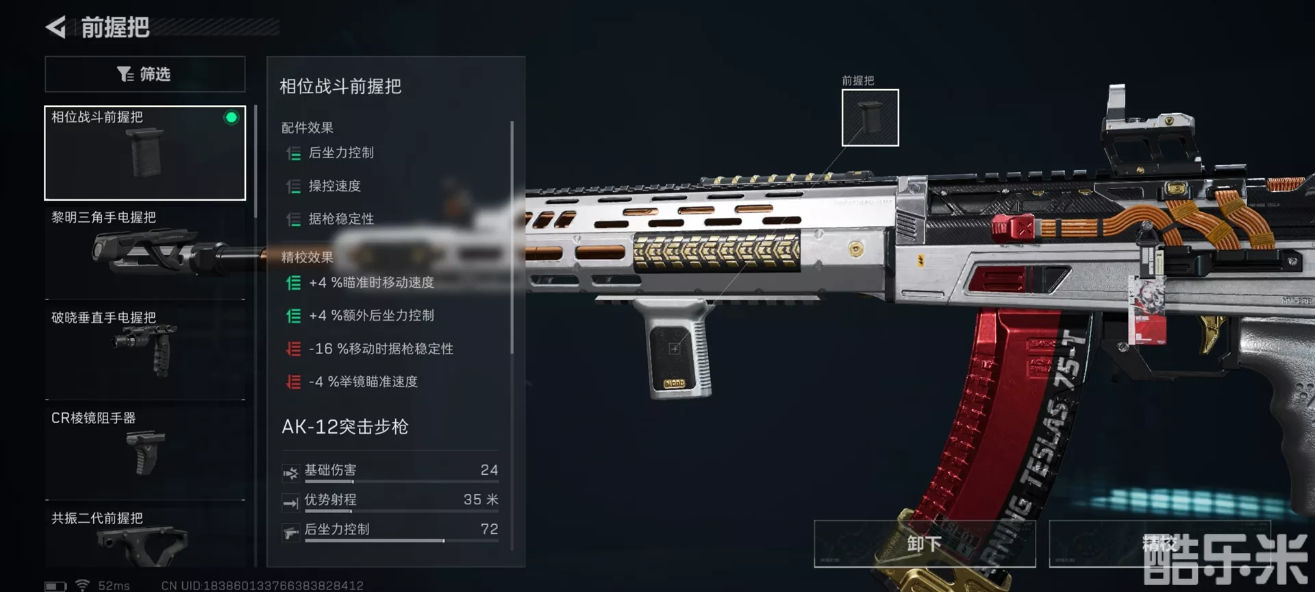 前握把选择相位战斗前握把。这个握把在没有负面属性的情况下,对后坐力控制、操控速度、据枪稳定性都有很明显的提升。
