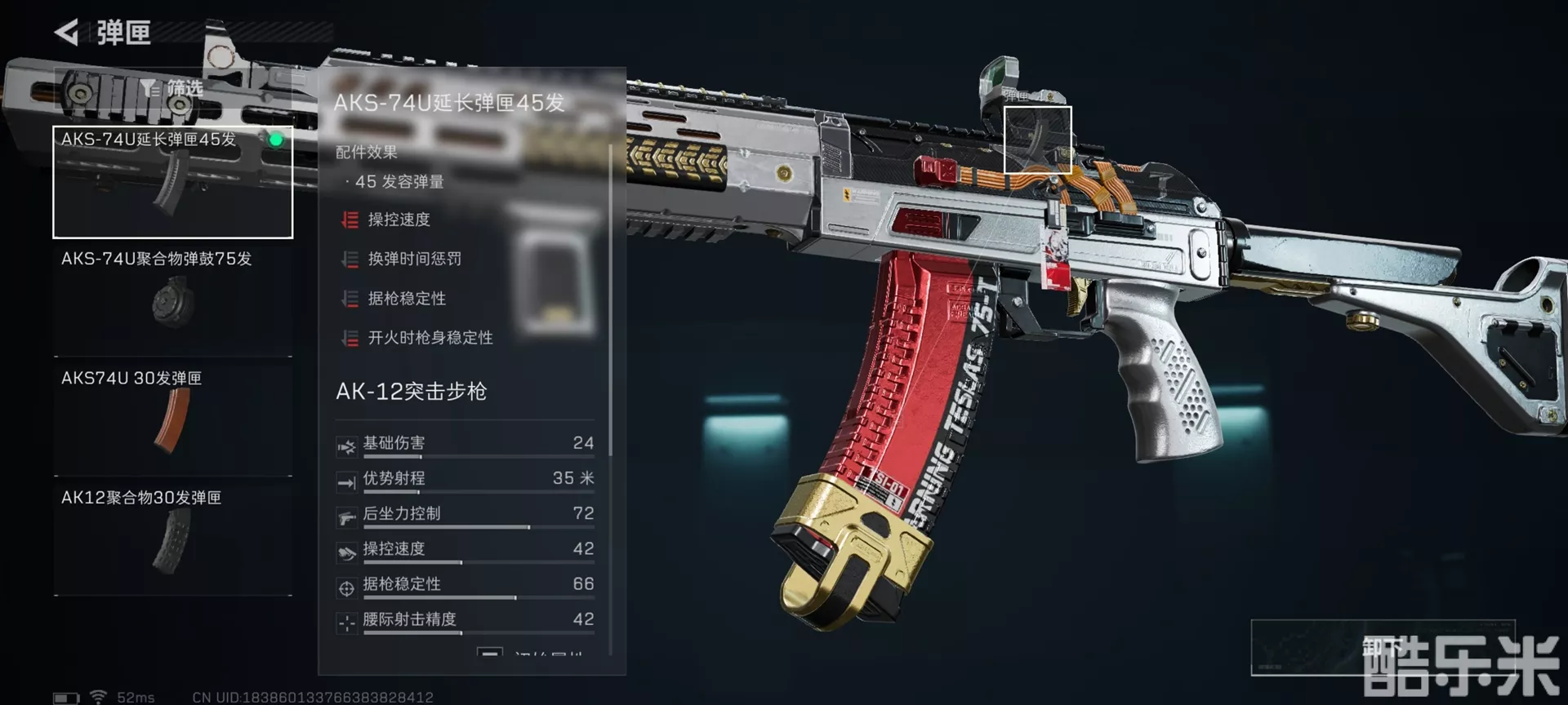 弹夹选择AKS—74U延长弹匣45发,提升容错率以及续航能力。