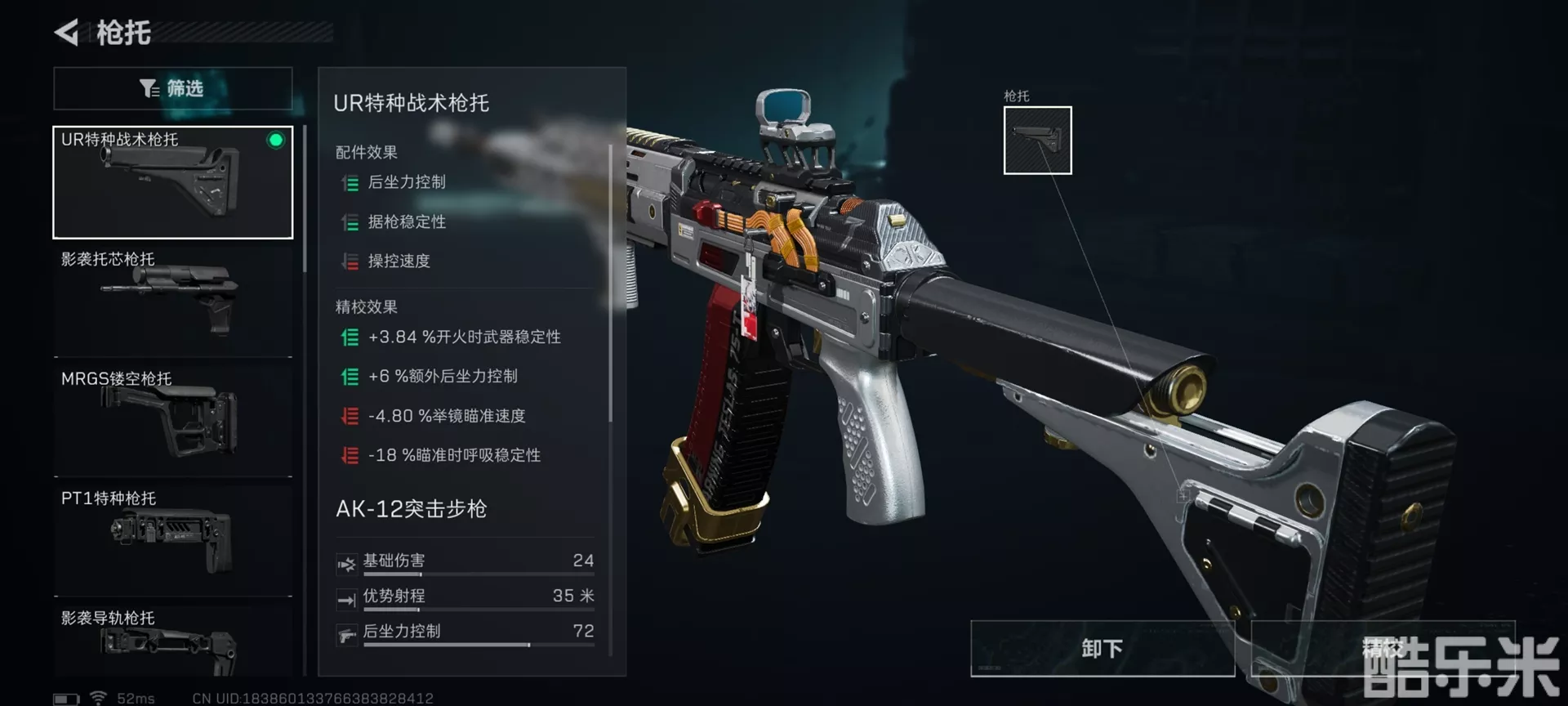 枪托选择UR特种战术枪托,这个枪托可以有效提升后坐力控制以及举枪稳定性,接下来是枪械精校。