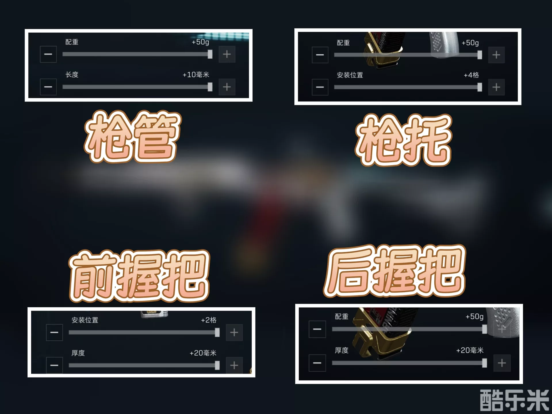 枪管、前握把、枪托、后握把的精校全部向右拉满。在最小程度减少枪械操控速度的情况下,提升枪械的稳定性在实战以及靶场能够拥有更好的压枪表现。