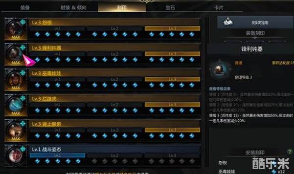 铭刻选择上怨恨3、拦路虎3、精气吸收3为优先级最高的组合,战斗姿态1级即可满足基础需求,若资源充足可补充稳操胜券3级铭刻。宝石选择7级性价比较高,技能符文需重点配置爆裂炮、嘲讽、盾冲、盾击、盾推、反击、落雷及跃击。若技能点不足,可暂缓盾击3级三脚架与盾反2级三脚架的加点。