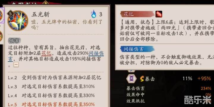 三技能需要3火释放,可以对敌方目标增加2层的花忆,并对其造成290%的间接伤害,然后对敌方其他目标造成195%的间接伤害。升级3技能可以提高间接伤害的倍率,还能增加2层的花忆,配合被动技能达到6层花忆可以释放雨四光,这二、三技能可以互相配合,是歌留多循环技能的关键。