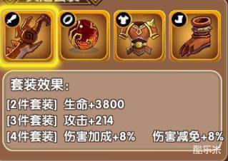 炙焰套(橙):2件-生命+3800、3件-攻击+214、4件-伤害减免+8%,伤害加成+8%