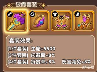 破霞套(橙):2件-生命+5500、3件-闪避率+8%、4件-抗暴率+8%,伤害减免+8%