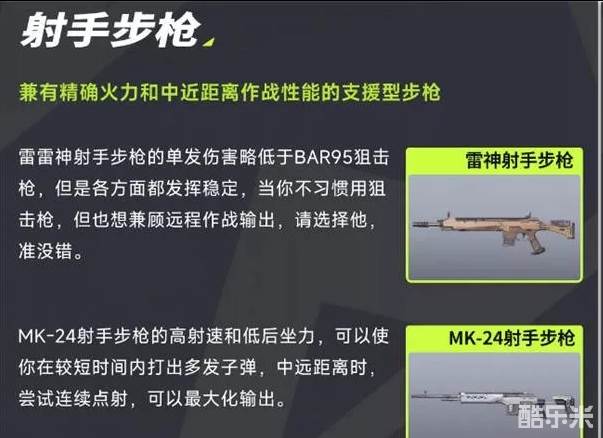 雷雷神射手步枪的单发伤害略低于BAR95狙击枪,但是各方面都发挥稳定,当你不习惯用狙击枪,但也想兼顾远程作战输出,请选择他,准没错。