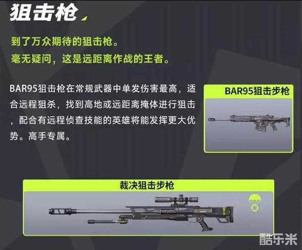 BAR95狙击枪在常规武器中单发伤害最高,适合远程狙杀,找到高地或远距离掩体进行狙击,配合有远程侦查技能的英雄将能发挥更大优势。高手专属。