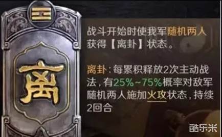 累积释放2次主动战法,有概率对敌军随机两人施加火攻状态。