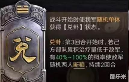 卦象解读:兑卦可以有效地克制治疗体系队。尤其针对忘私相助、邓艾等治疗大户,兑卦的断粮效果可有效削减其回复优势。
