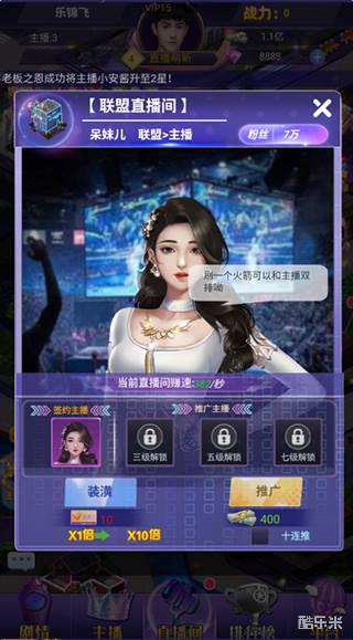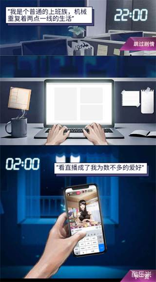 1、进入游戏后,会有一段背景故事。主角以前只是一个平民,但他有一个做主播公司的梦想。一次偶然的机会中了10w,于是他开始了创业的生涯。