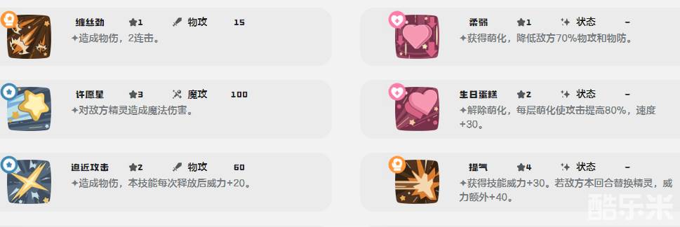 从输出方面来看,超级糖果就是绝对的主力,会有130威力的物理性伤害,这点还是很给力的,直接就可以获得一个萌化状态。触底强击也很有意思,魔法伤害基础大概是60个威力,要是放技能就刚好是能量耗尽。威力数值可以先加100打爆发还是比较好用的,另外还有一个迫近攻击。每一次在放完之后,威力就可以直接上涨20,叠加几次之后就可以直接叠满伤害,对于血厚的对手还是很管用的。