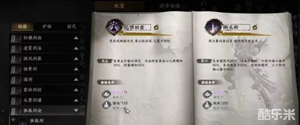 在武学秘籍中,玩家可以找到独孤剑诀,其中包含忘情回首和断无断两个剑诀。这两个剑诀需要满足一定的领悟条件,例如忘情回首需要破军丹和悟性125,断无断则需要灭军丹和剑术850。玩家可以通过游商购买丹药配方,并集齐材料进行炼制,完成条件后即可同时解锁这两个剑诀。