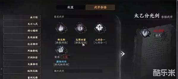 太乙分光剑的获取首先需要完成江湖奇遇中的“太乙金光剑参悟”任务。这个任务可以随机触发,但玩家可以直接前往不夜京(1531,127)或齐国(1530,127)找到神秘高手对话,从而触发任务。任务完成后,玩家可以在武学界面中找到太乙分光剑,并开始解锁四个剑诀。