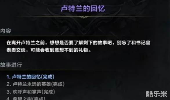 获取方法:在卢特兰城的卢特兰王宫与希里安对话接取,任务初始阶段名为“卢特兰的回忆”,为紫色任务,在跑完卢特兰主线后出现;