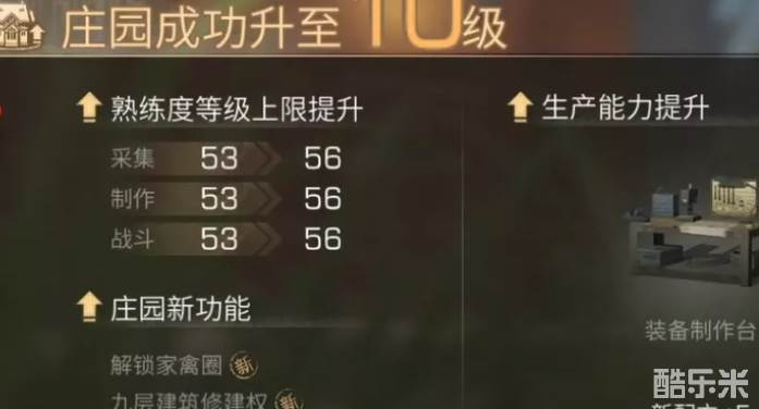 庄园的升级离不开物资收集和熟练度等级提升,只有这两项都达标了庄园才能稳步升级。熟练度分为采集熟练度、制作熟练度和战斗熟练度三种。采集熟练度可以通过砍树、采麻、挖矿、钓鱼来提升;制作熟练度可以通过配方或装备制作台,加工半成品和制作装备等获取;战斗熟练度可通过攻击感染者、区域行动或者参与敌对势力讨伐等途径获取。