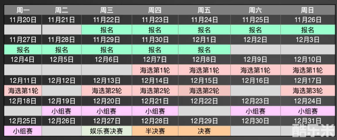 在获取参赛资格后到12月7日前的这段时间内,玩家将有几天时间和队友们磨合训练。接着便将参与总计3轮的海选赛,海选赛分为3轮进行,分别于12月7日-11日、12月13日-15日和12月17日进行。第一轮采用固定时间天梯匹配的模式进行,第二、三轮则采用积分赛模式进行,在这一万多支报名队伍中,仅有59支战队能够杀出重围成功晋级。