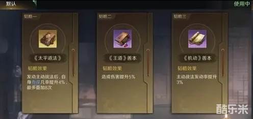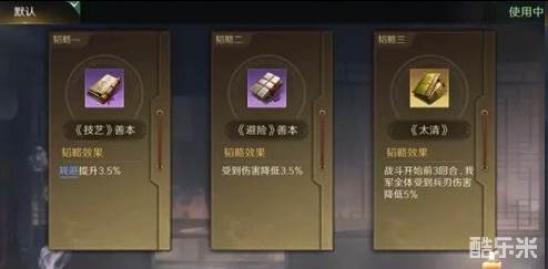 2.于吉战法:风急雨晦+料事如神+避其锐气。韬略库:太平经(专属)+束伍善本+强战善本。弩兵特性劲弩,专精点亮密雨箭岚。