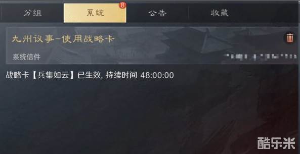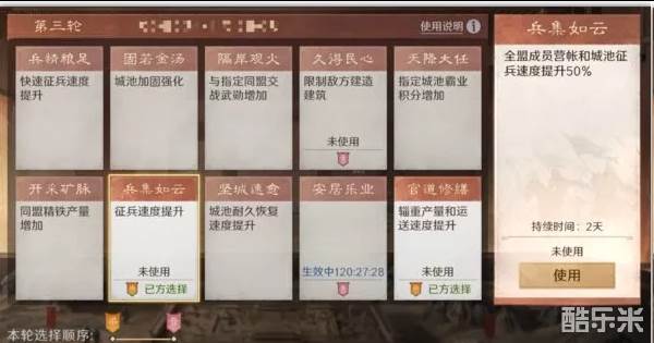 公示期结束后,系统界面将会出现“使用”按钮,在公示期结束至本轮九州共议结束前,拥有指挥权限的官员可以择机使用九州战略卡,使用得当将有机会扭转战局,同盟策略维度更加丰富。